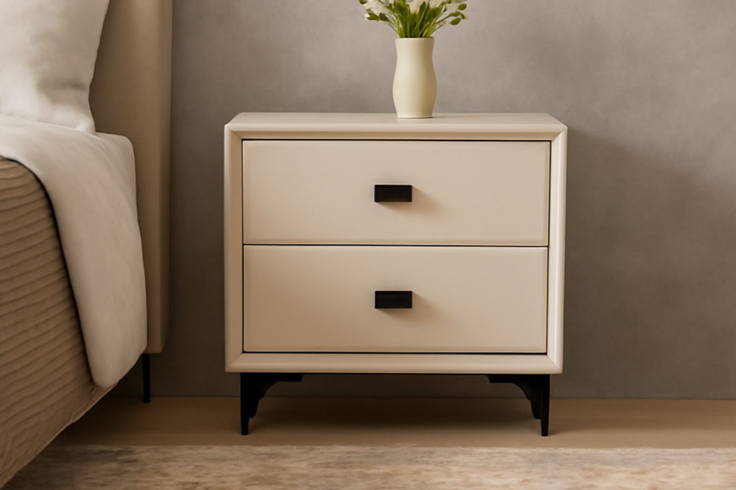 Introducing the ALANYA 2-Drawer Bedside Table in Champagne, a stylish addition to your bedroom ensemble. Draped in elegant Leather, this bedside table emanates sophistication. With a durable engineered wood frame and accented by sturdy metal hardware, it harmonizes timeless aesthetics with practicality. The two drawers provide convenient storage for your essentials, offering both functionality and opulence. Elevate your bedroom decor with the ALANYA Bedside Table, where the refined champagne color adds a touch of luxury to your space. Experience the seamless blend of style and utility with this exquisite piece of furniture. Indulge in the perfect marriage of elegance and practical design for your bedside needs.