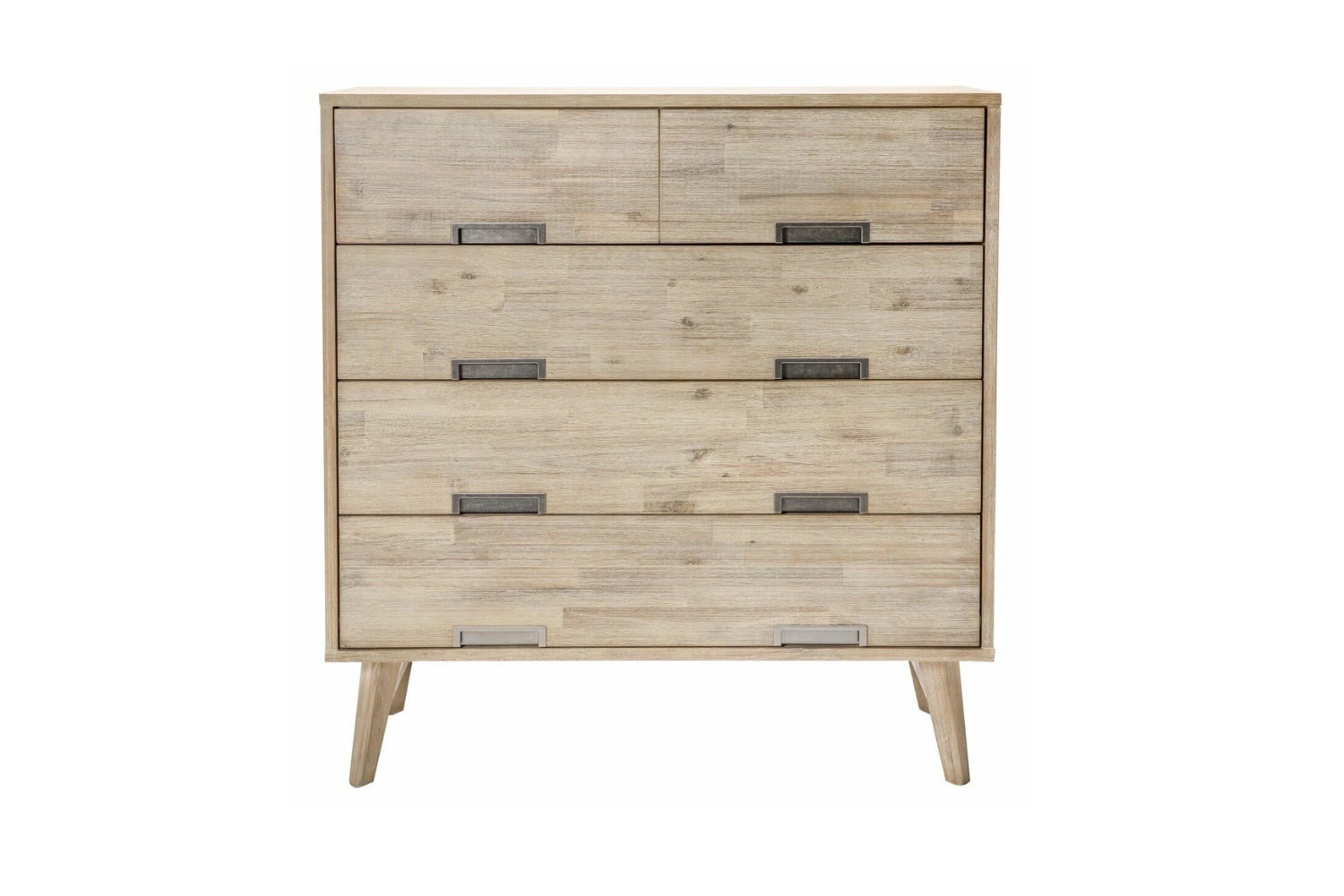 Acacia tallboy and bedside table featuring draw pulls and splayed timber legs.