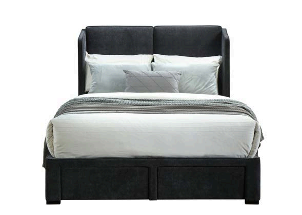 Upholstered bed featuring a winged headboard and 2 storage drawers at foot-end.