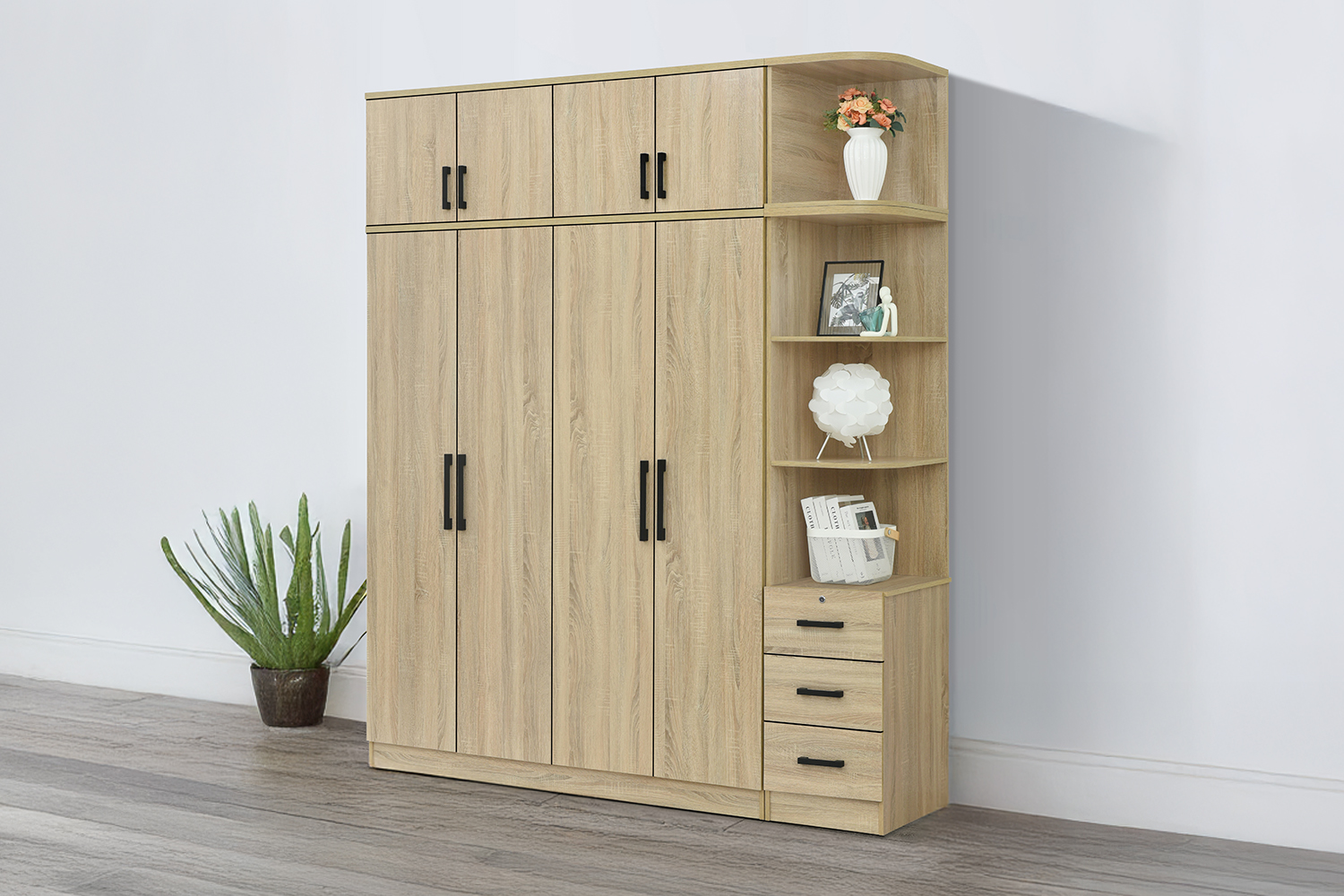 Comprehensive Modular Design: Includes a 4-door wardrobe, 4-door top unit, 3-tier display shelf with drawers, and a top curved corner display shelf for versatile storage and styling options.