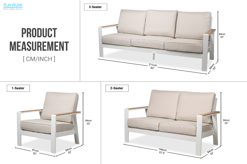 - Premium Aluminum Frame: This modern patio furniture set is made of a powder-coated aluminum frame that is both solid and durable while being lightweight. Aluminum outdoor patio furniture is resistant to fading, rusting, and corrosion.