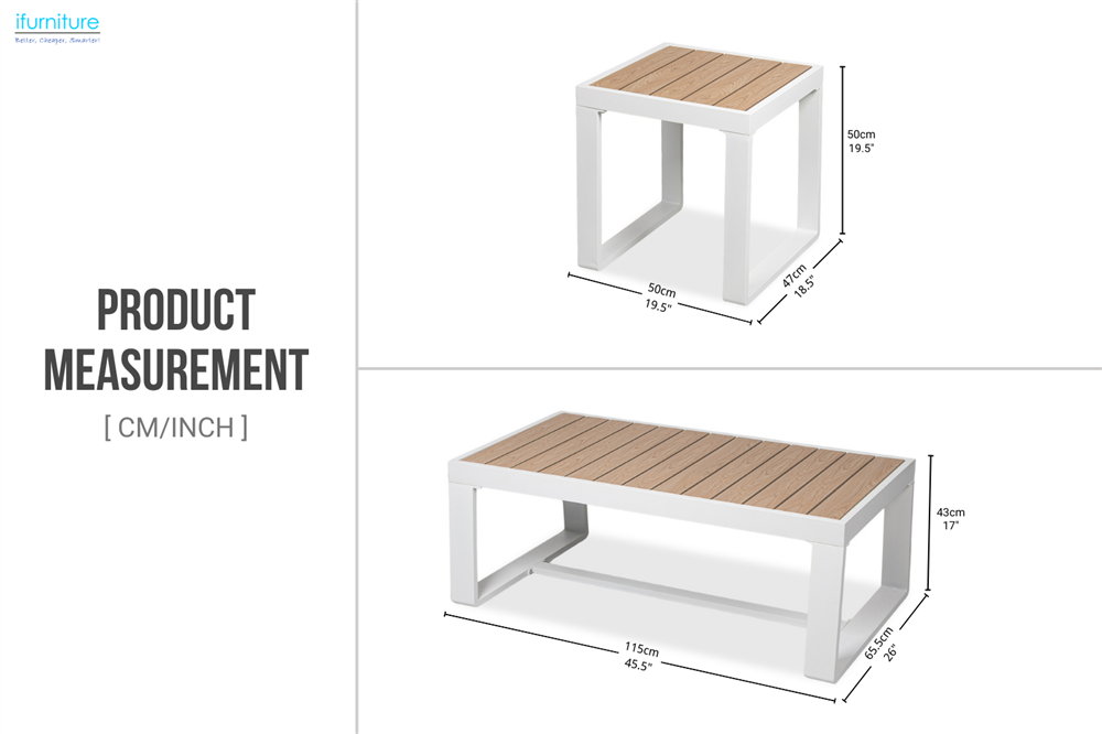 - Durable Polywood Decorative Panels Table: The modern aluminum outdoor patio furniture coffee table boasts a visually appealing and touchably smooth polywood decorative panels tabletop. Unlike tempered glass, it is resistant to sudden cracking caused by high temperatures.