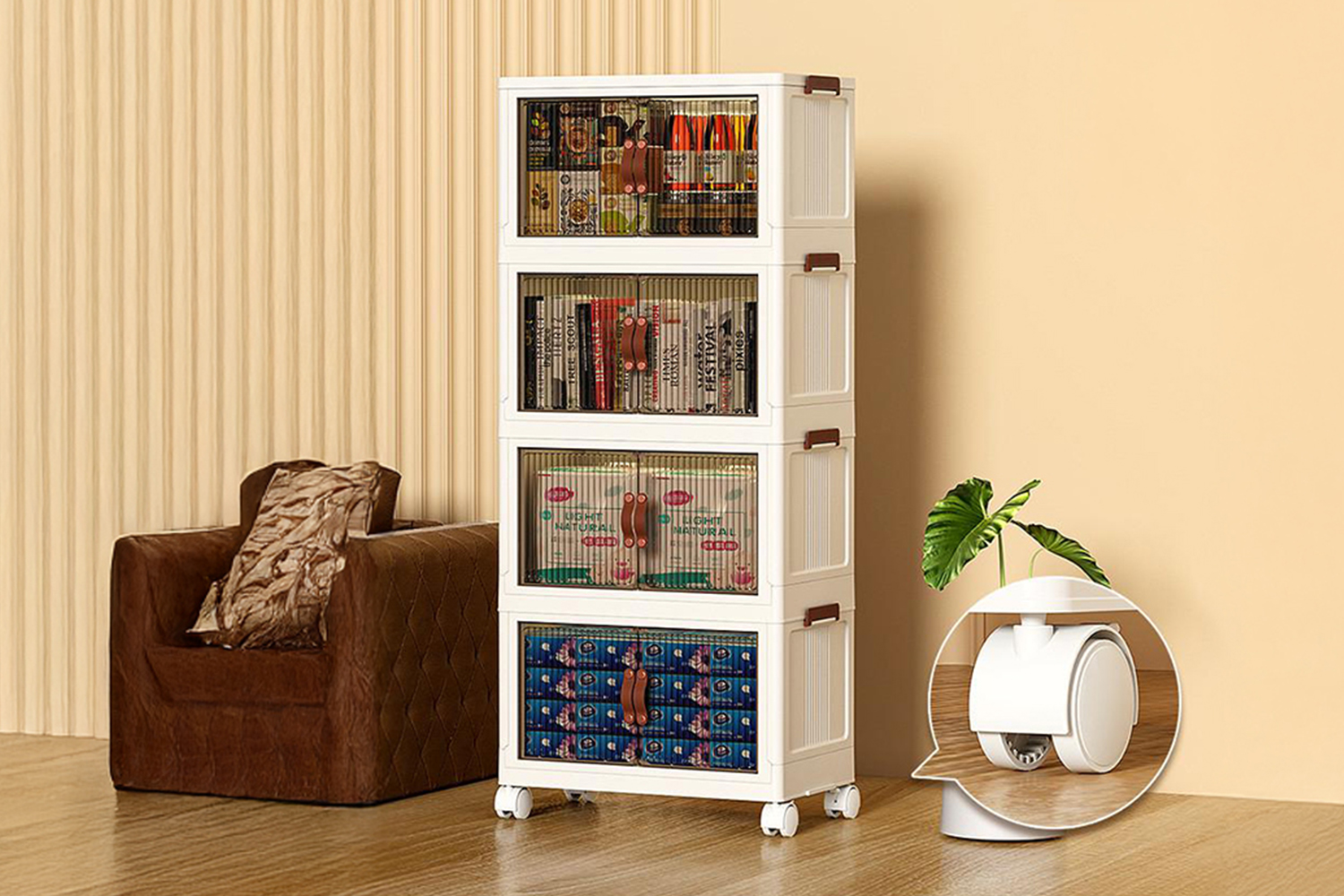Keeps everything organised: Four shelves so each item has its own place. Perfect for snacks, cleaning products, office bits and bobs.
