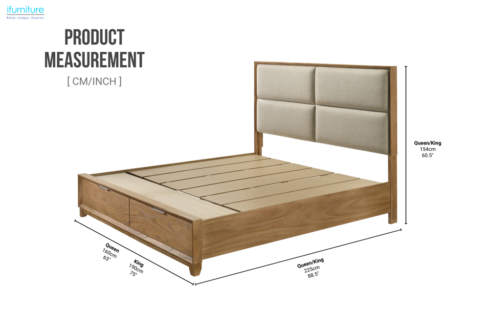 With built-in storage drawers at the footboard, a padded fabric headboard, and a solid wood frame finished in mindy veneer, this bed frame offers a balanced mix of practicality and modern design. Its low-profile form brings a clean and grounded presence to the room.