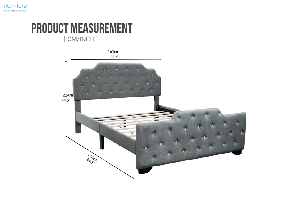 This upholstered bed frame combines comfort, support, and timeless elegance. Soft foam padding paired with smooth fabric upholstery creates a refined, inviting feel, while closely spaced wooden slats deliver reliable mattress support and lasting stability. The gracefully curved headboard, finished with elegant button tufting and classic nailhead trim, adds a sophisticated focal point to any bedroom.