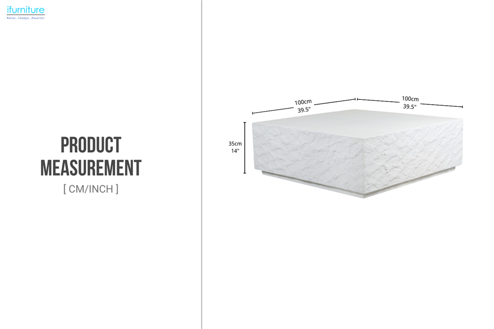 Crafted from sturdy yet lightweight FRP(Fibreglass Reinforced Plastic), this coffee table blends everyday functionality with artistic appeal. The chiselled, stone-like texture along the sides adds sculptural charm, while the smooth, flat top provides a practical surface for décor and daily items. Its modern, minimalist cube design makes it a striking addition to any contemporary living space.