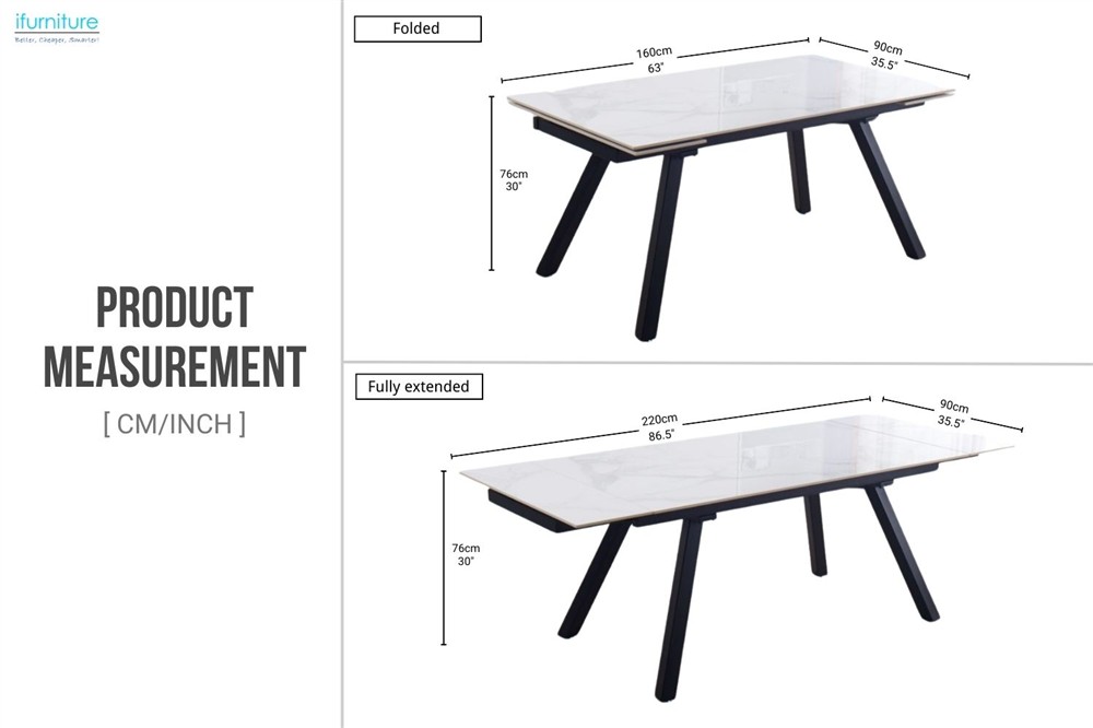 This white sintered stone table top and black-painted base extension dining table is a stylish and functional addition to any modern dining room. Its high-quality materials and attention to detail make it a durable and long-lasting investment for your home.