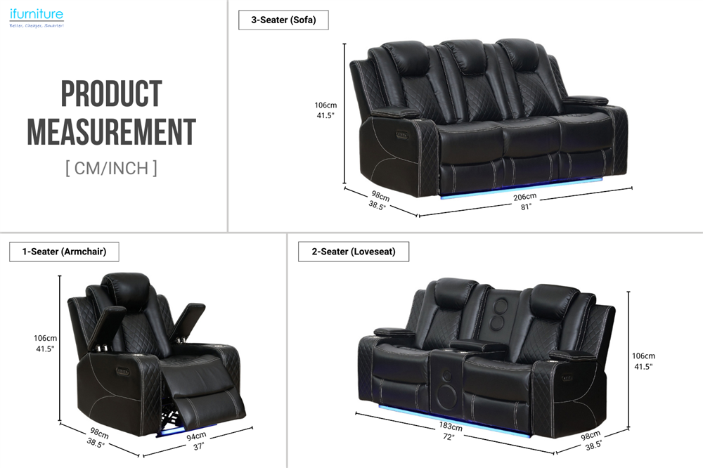 • Wireless Charging and USB/Type-C Ports: Each sofa is equipped with built-in USB and Type-C charging ports for easy device charging, while the 2-seater and 3-seater models also feature wireless charging pads for a truly cable-free experience.