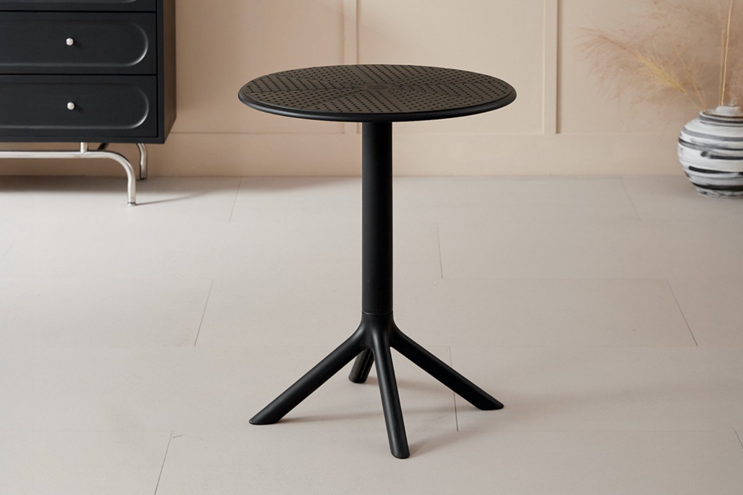 The FLORINA D60 Round Dining Table is the perfect blend of modern aesthetics and durability. Crafted from high-quality PP material, this table is designed to withstand the elements, featuring UV resistance and waterproof properties. Its perforated surface not only adds a unique texture but also ensures easy maintenance. The sleek black finish and minimalist design make it a versatile addition to any dining space, whether at home or in a commercial setting.