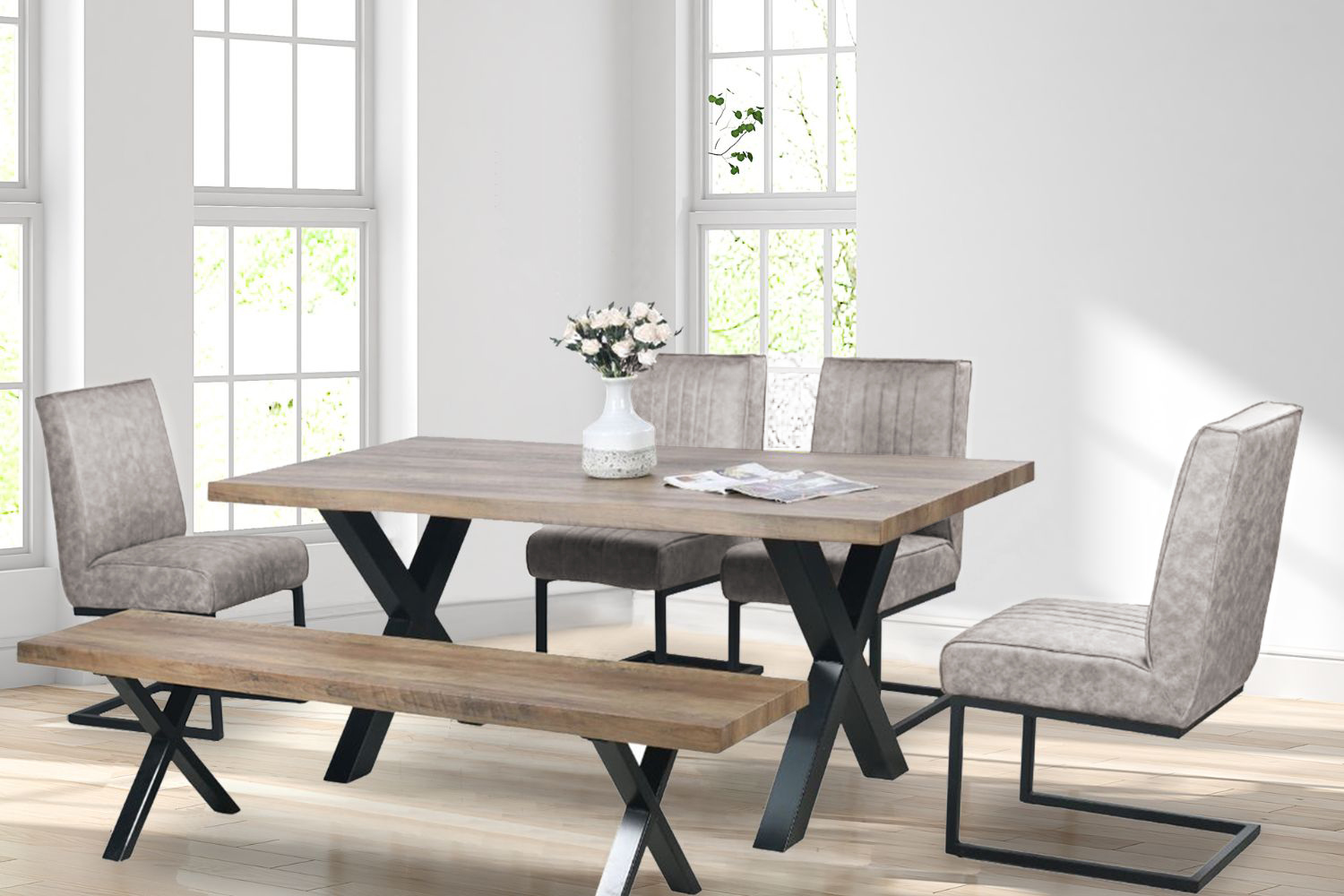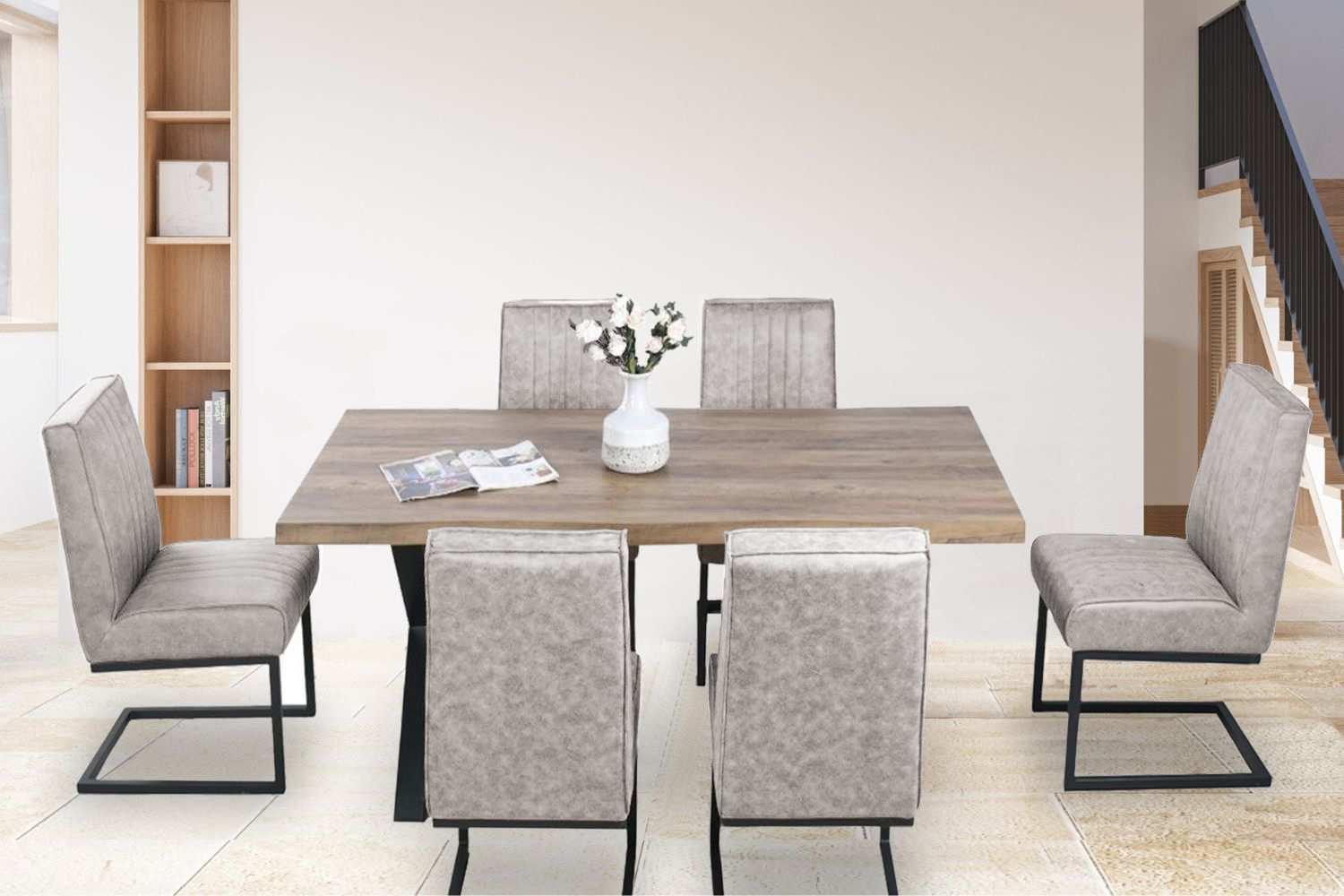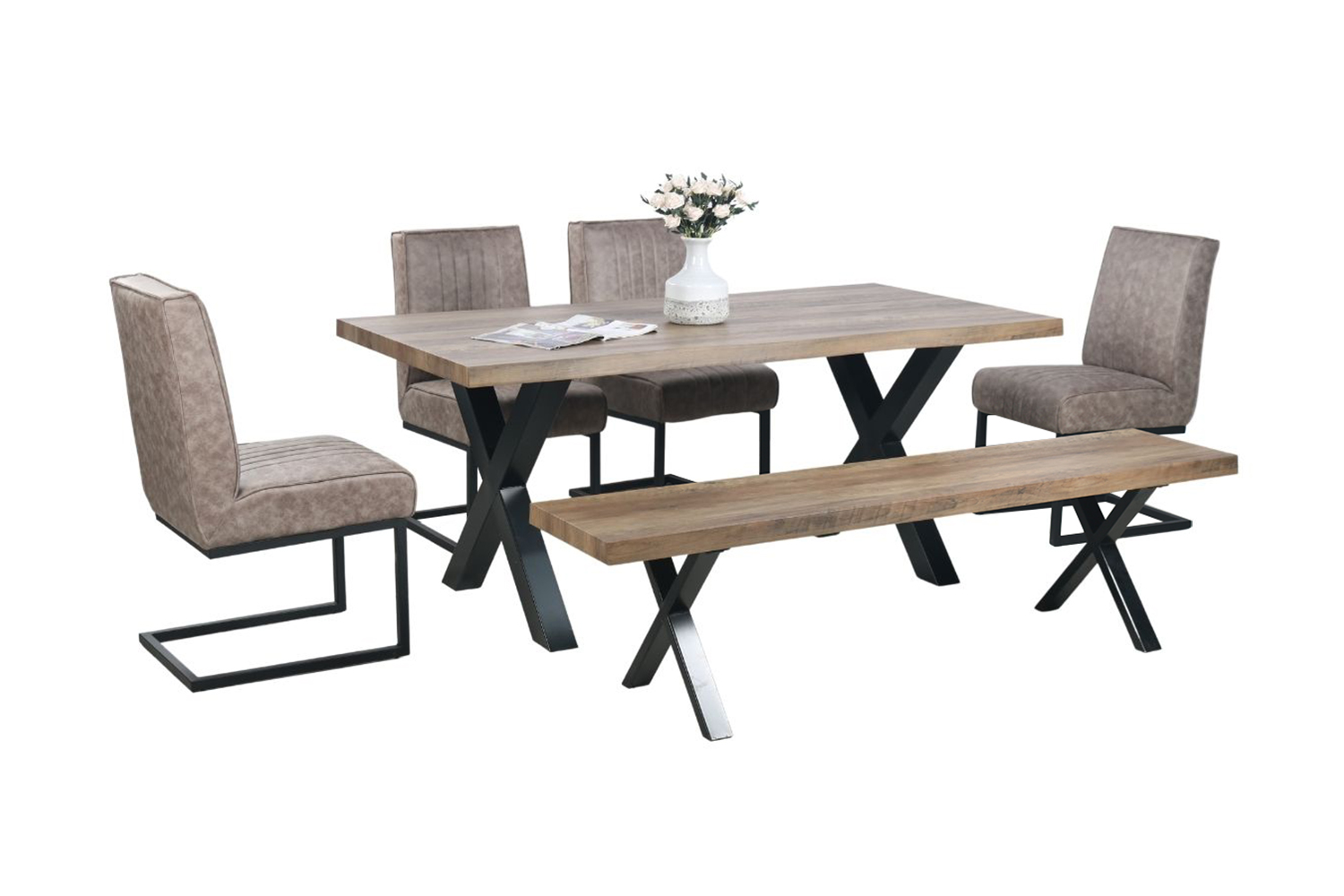 The GALLOP series consists of dining chairs, a dining bench, and a dining table. The frame is of black steel with powder coated. The GALLOP dining chairs have a cantilevered frame design and offer a very comfortable seat and back in a cross-hatch patterned fabric. The chair also comes with arms with a twistable seat as well.