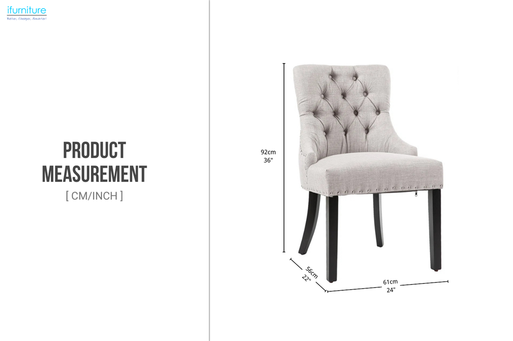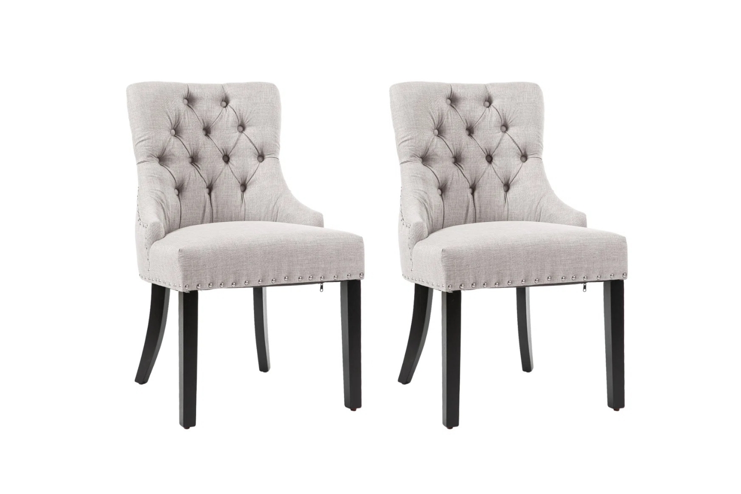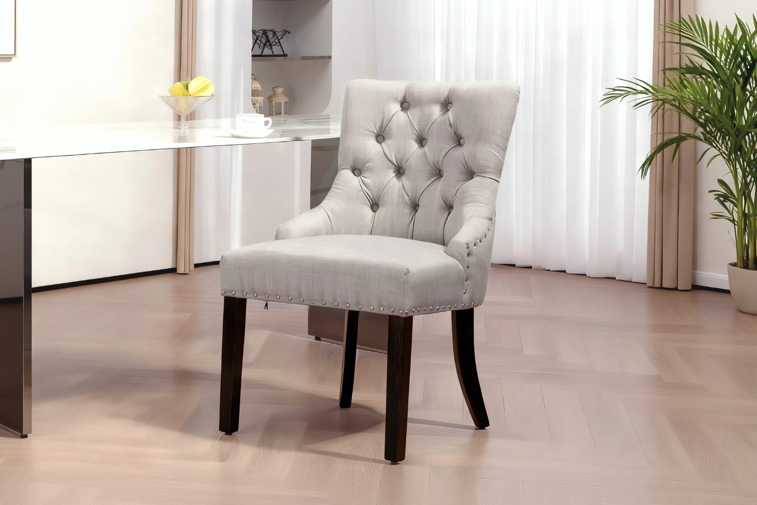 Add a refined, classic touch to your dining space with the HALMYN Dining Chair. Upholstered in a soft linen-touch fabric, generously foam-padded, with solid wood legs, it features a button-tufted high back for elegant support and a plush seat cushion for comfortable dining. Finished with decorative nailhead trim and a chic ring pull handle on the back, this chair combines timeless style with everyday durability.