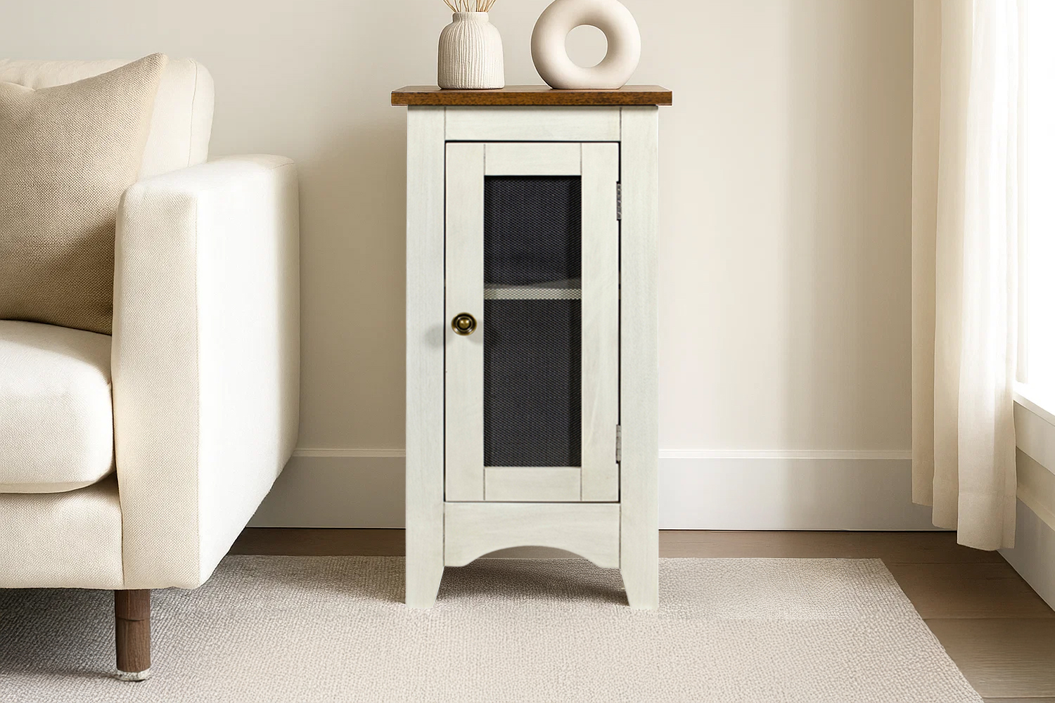 This stylish side cabinet features a rich espresso top and an antique white finish for a two-tone look. The metal mesh door opens to reveal a fixed interior shelf, perfect for organizing and storing items. Classic round metal pull handles add a touch of elegance and ensure easy access to the storage space.