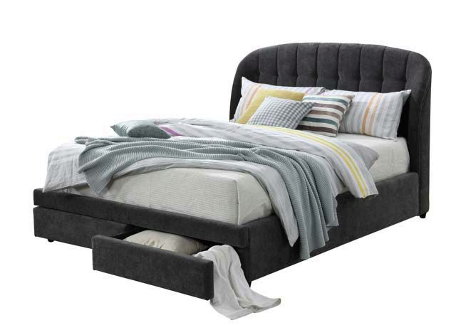 Stylish curved bedhead with vertical lines, features 2 drawers at footend upholstered in Venice Fabric.