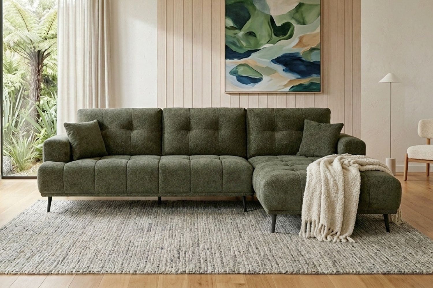 Experience the perfect blend of style and comfort with the LAWTON Fabric Sectional Sofa. Its supportive, plush cushions, upholstered in a stunning forest green fabric, bring both luxury and relaxation into your home. Finished with sleek metal legs and two cozy throw cushions, this sofa is a stylish, durable addition to any space.