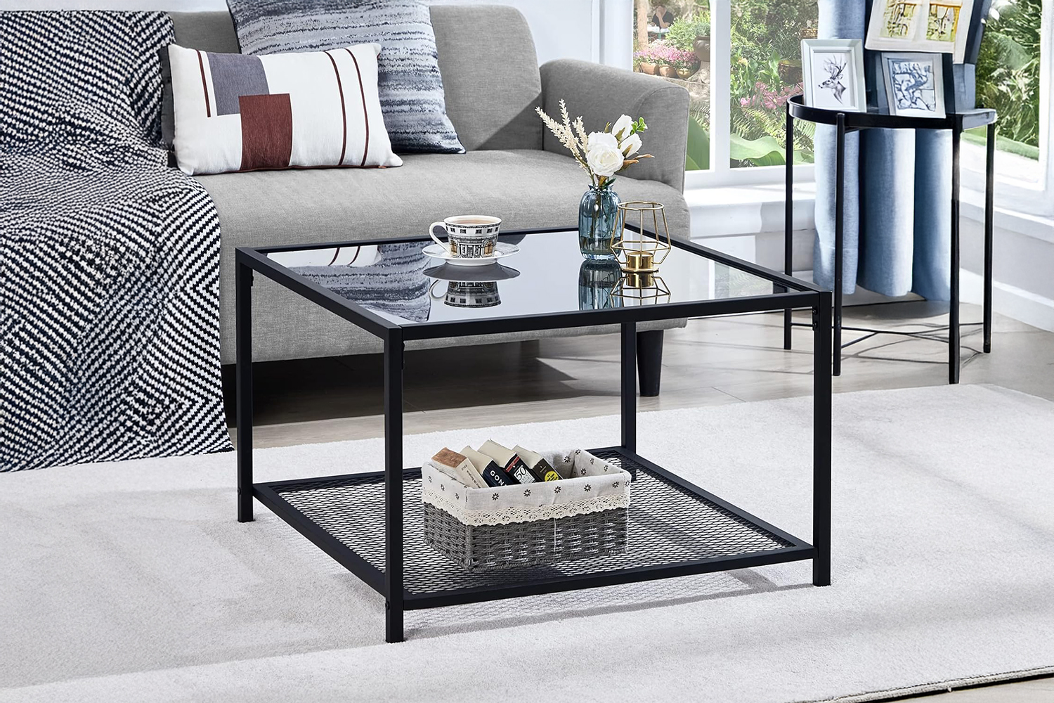 Shop this 2-Tier Coffee Table with a storage shelf, featuring durable explosion-proof tempered glass and a sturdy metal frame. Its modern-industrial design fits perfectly in any living room, bedroom, office, or balcony, offering both style and functionality with a minimalist touch