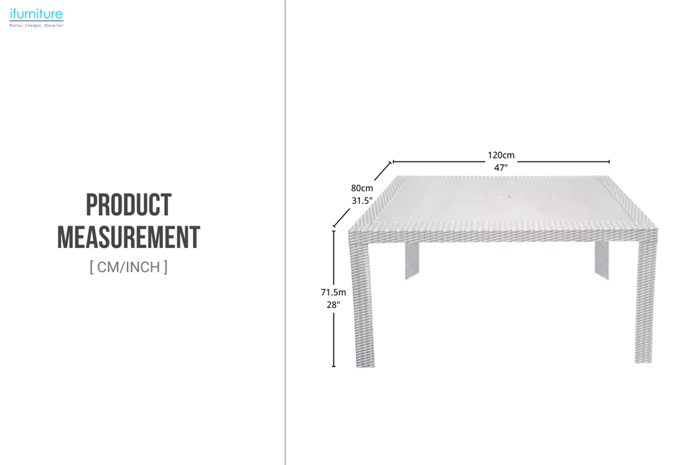 The LUCERNE 120 Dining Table features a clean rectangular design crafted from durable PP material with UV protection. Designed for outdoor and indoor dining, it offers excellent weather resistance, easy maintenance, and a modern woven-look finish that suits interior, patio, balcony, and garden space layouts.