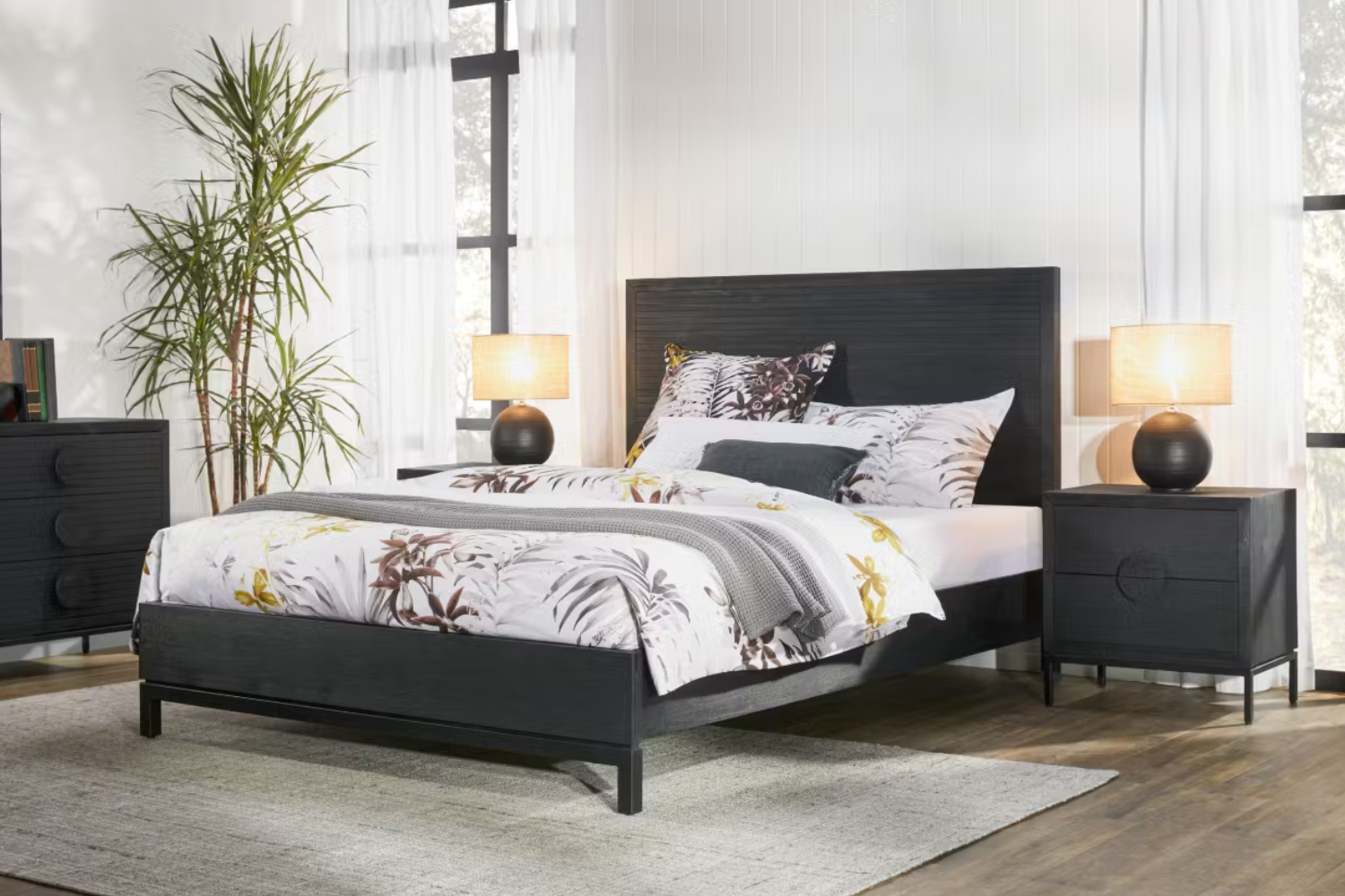 Introducing the Meika Bed Frame, a neutral and modern addition to your bedroom. The Meika brings you Acacia Veneer in the colour Midnight Grey with minimalistic black metal legs. The sleek grooved deign of the headboard is sure to add a touch of sophistication to your bedroom.