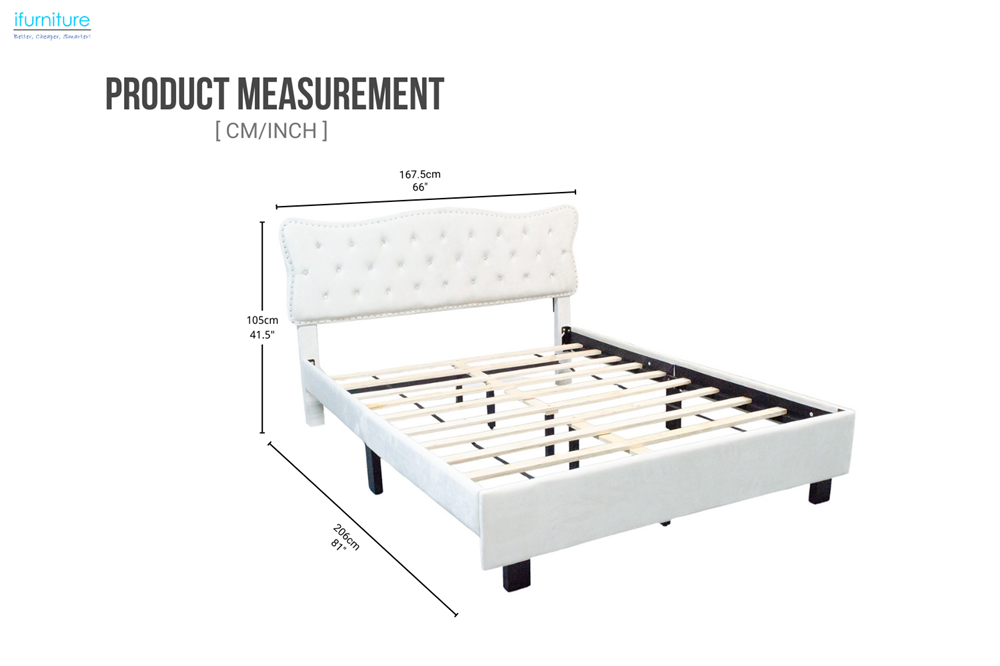 This upholstered bed frame combines comfort, support, and timeless elegance. Soft foam padding paired with smooth fabric upholstery creates a refined, inviting feel, while closely spaced wooden slats deliver reliable mattress support and lasting stability. The gracefully curved headboard, finished with elegant button tufting and classic nailhead trim, adds a sophisticated focal point to any bedroom.