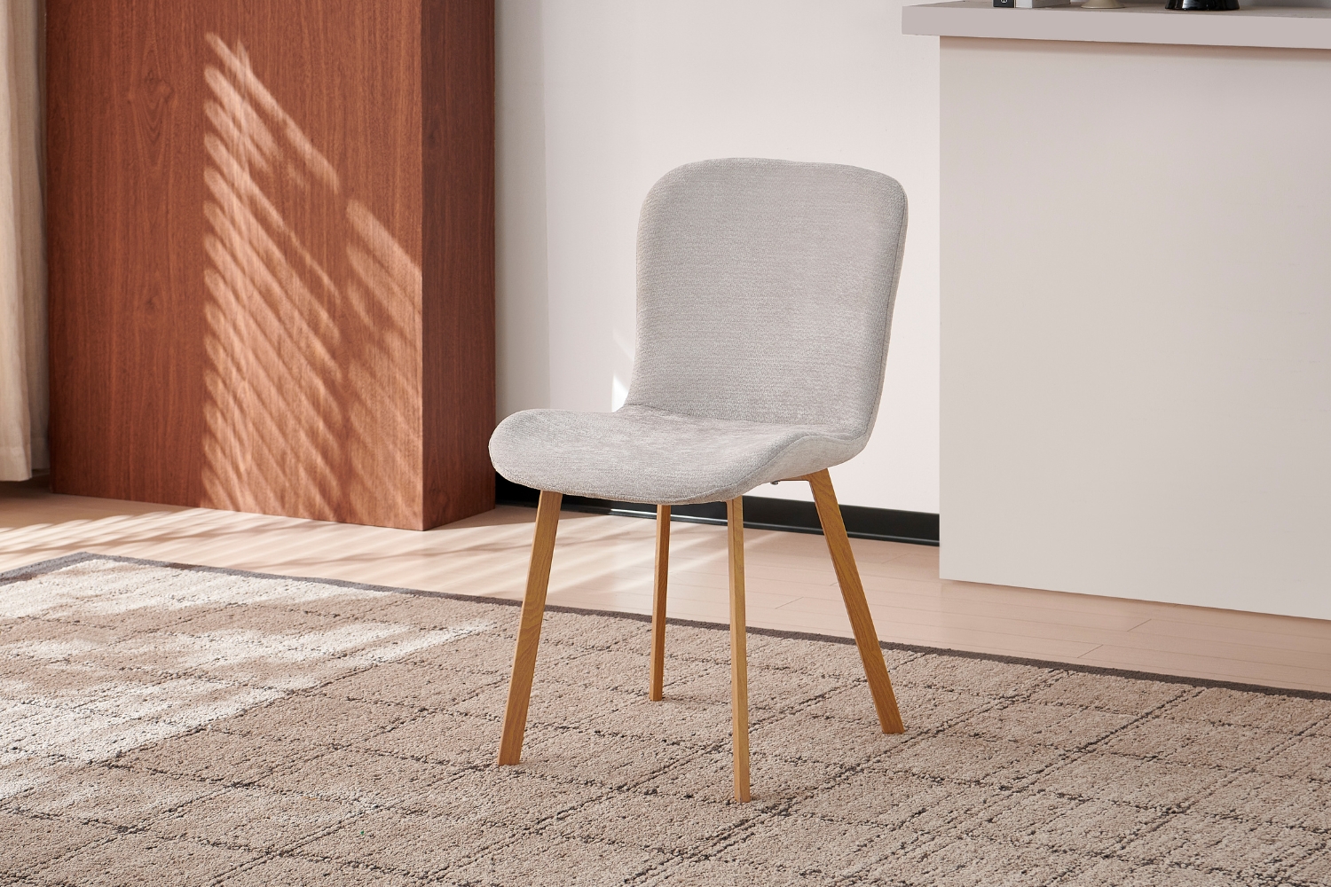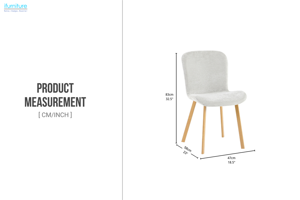 This modern dining chair features a softly padded seat and curved backrest for comfortable, supportive seating. Upholstered in smooth fabric and finished with wood-grain metal legs, it blends warmth, stability, and contemporary style—perfect for dining rooms, kitchens, or home offices.
