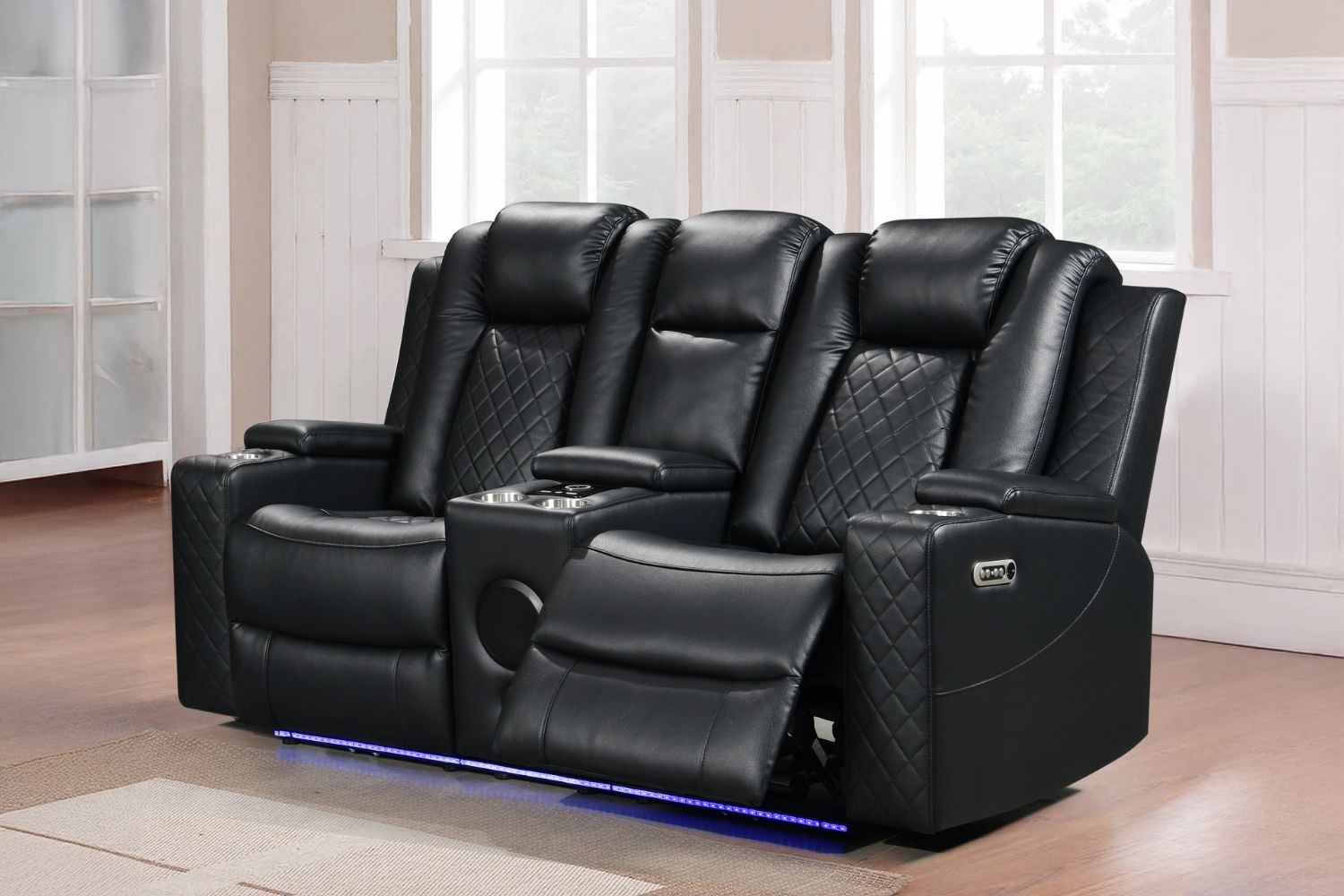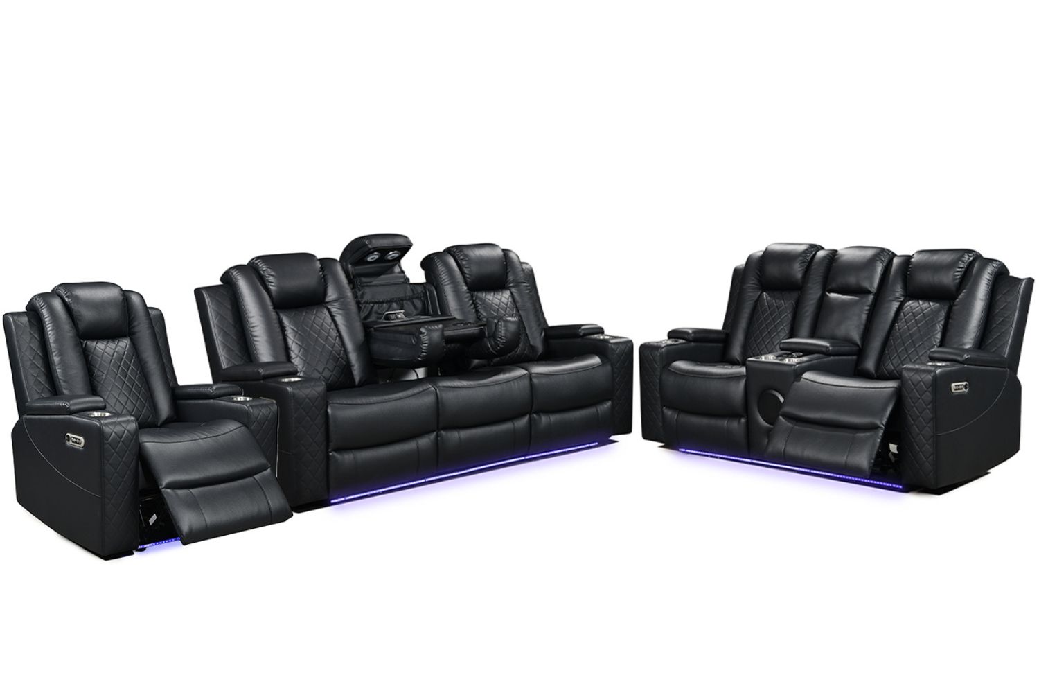 MONROSE Air Leather Dual Motor Reclining Sofa Range (Black) - 3 Seat with Drop-Down Console USB Port, Power Socket & Wireless Charging (3RRC)