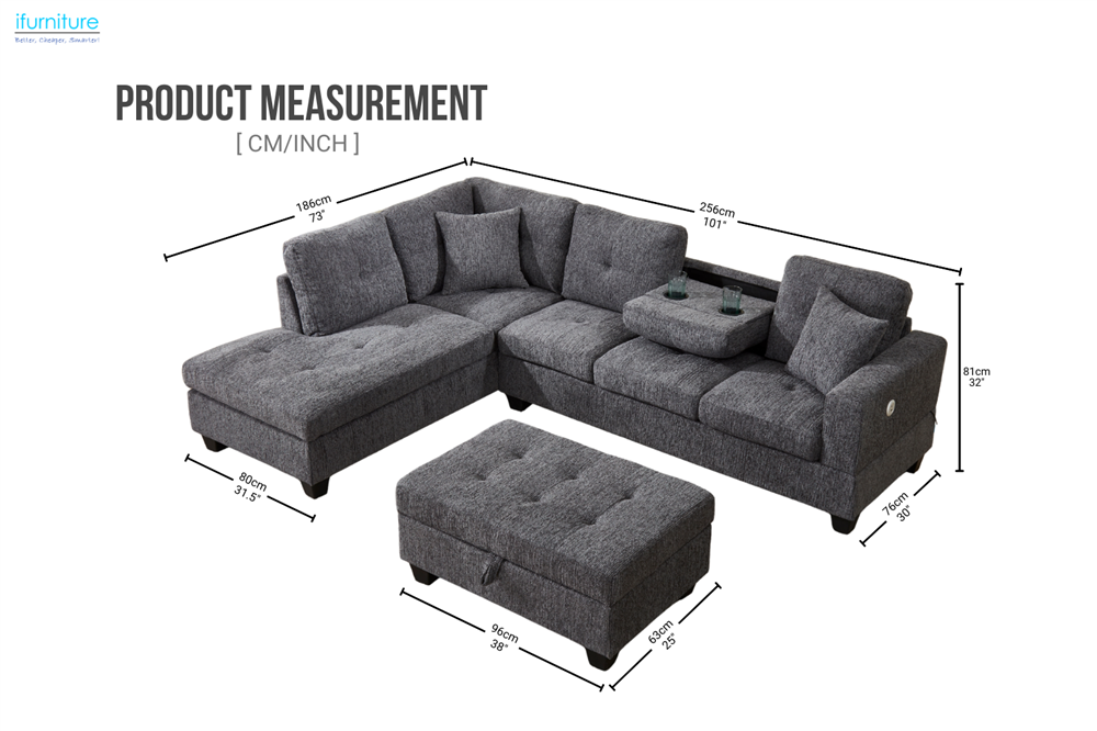 Upgrade your space with the NEBULA sectional sofa. Featuring a movable ottoman, drop-down console and USB port, it's perfect for gatherings. This dark grey upholstery is graceful. With chenille fabric and small pillows, it's both comfortable and durable.