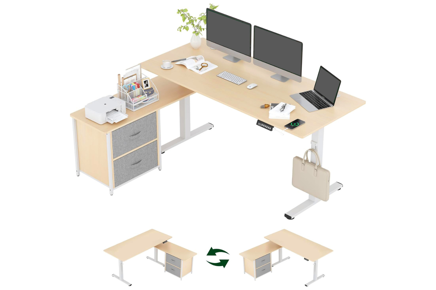 This electric height-adjustable desk lets you easily switch between sitting and standing to reduce strain and improve posture. It operates quietly and smoothly, with memory presets, a USB charging port, and a sedentary reminder. The sturdy steel frame and adjustable feet keep the desk stable, ideal for multiple devices. The eco-friendly desktop is durable and easy to clean. A reversible side cabinet allows flexible setups, while hooks, shelves, and cable management keep your workspace organized and tidy.