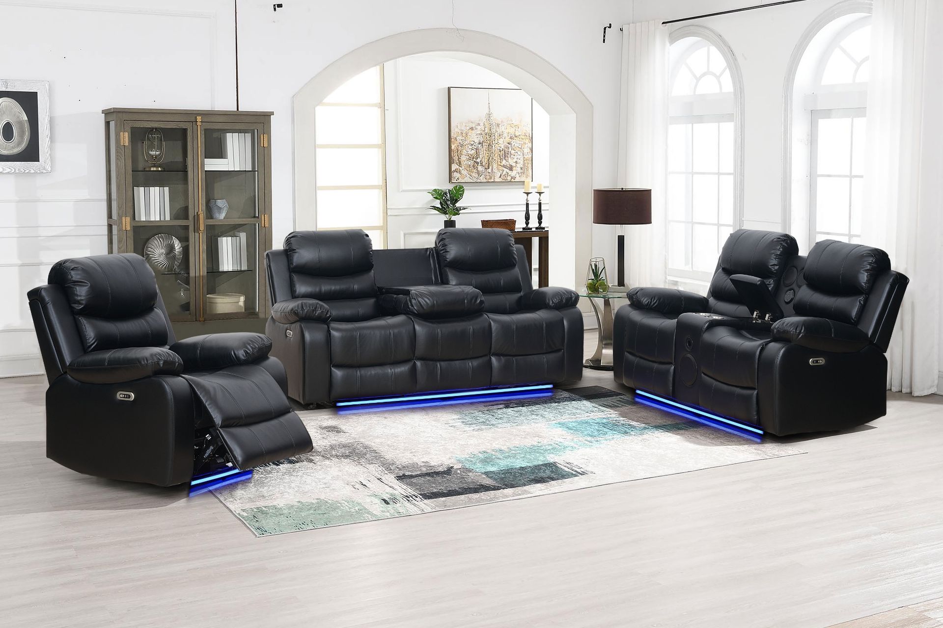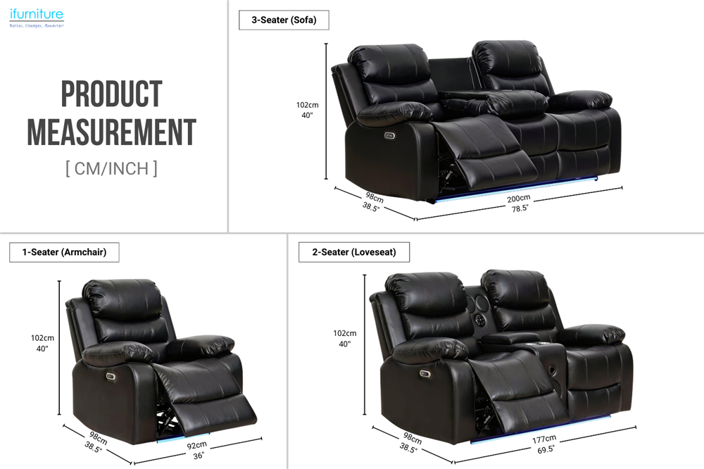 This 2-seater sofa combines durable air leather upholstery and a solid poplar wood frame for lasting comfort and support. The smooth electric reclining mechanism adjusts the backrest up to 150°. The centre console includes a Bluetooth speaker, cup holders, and storage. With integrated USB charging and blue LED base lighting, it adds both convenience and a home theatre-style atmosphere.