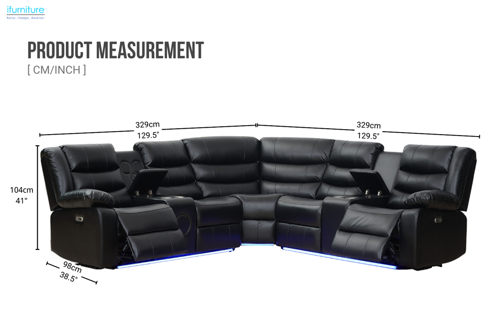 This sectional sofa features durable air leather upholstery and a solid poplar wood frame for lasting comfort and support. Each side offers electric power reclining, with backrests adjusting up to 150°. The console includes a Bluetooth speaker, AUX cable hole, storage, and cup holders. Multiple USB ports provide convenient device charging, while blue LED lighting adds a modern touch and creates a relaxing ambiance.