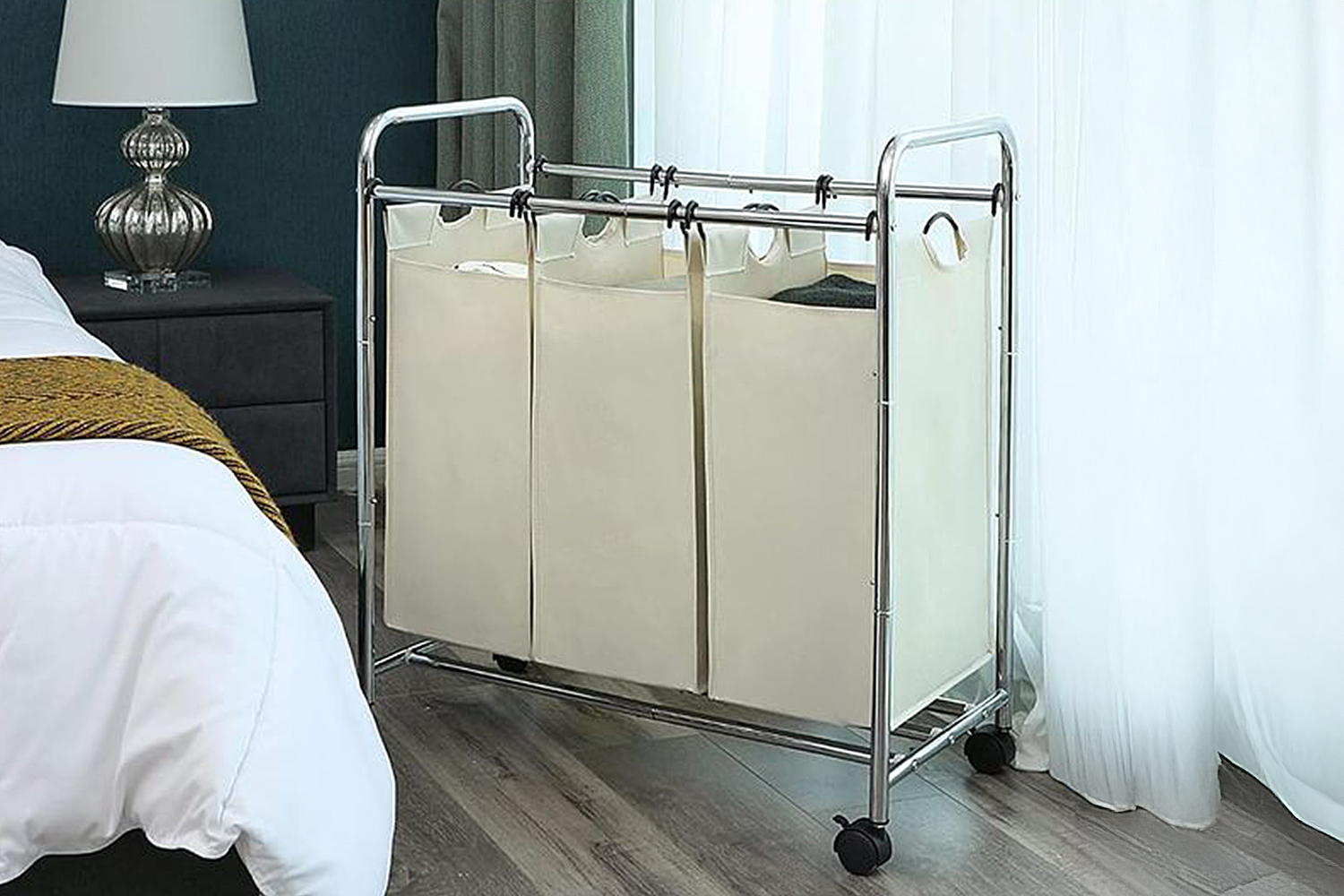The 3 Bags Laundry Sorter Cart is built with a sturdy metal frame and durable microfiber, ensuring long-lasting reliability. Its wheels facilitate easy mobility around the house, eliminating the need for heavy lifting. This sorter helps maintain a neat and organised home by efficiently separating laundry, making it an ideal space-saving solution.