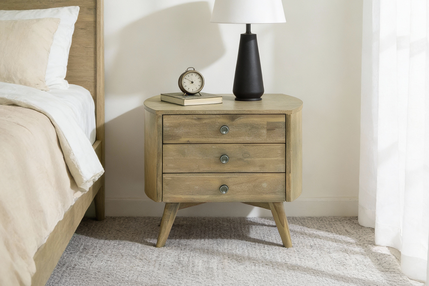 The Rialto Retro inspired bedside table is crafted from solid acacia wood, provides a robust and enduring storage solution that's designed to stand long. With its generous storage capacity Rialto 3-Drawer bedside table provides ample space to keep your clothing, accessories, and personal items tidy and within easy reach.