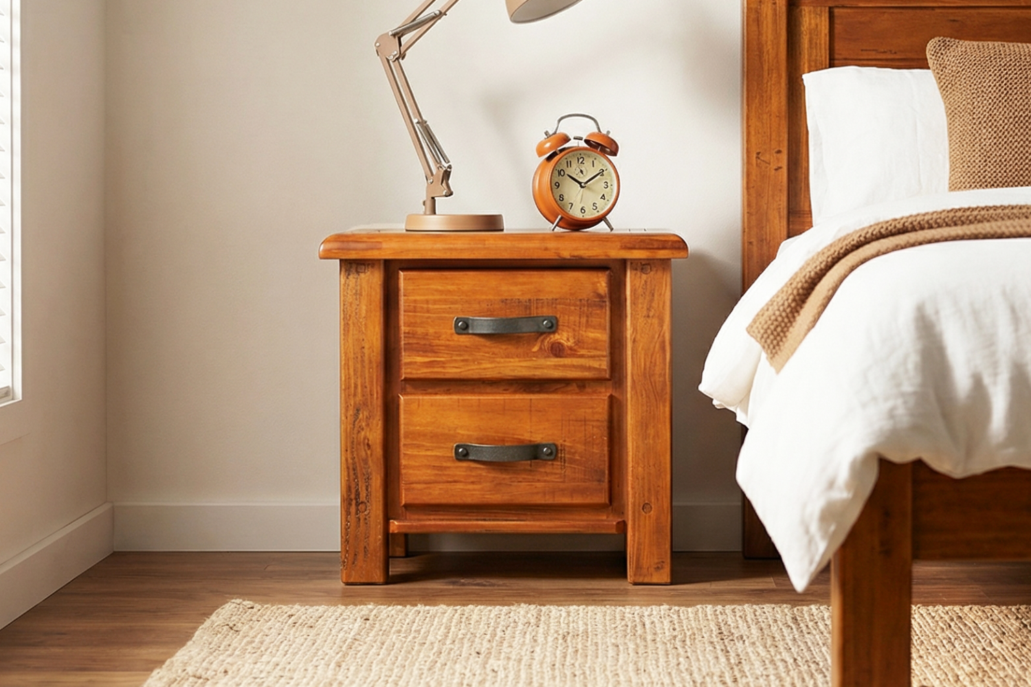 The range features solid metal handles, extension metal drawer runners, and nice rustic finishing in this classic design. Items display knot holes, timber grain, and carefully marked distressed features to enhance their rustic appearance. Give your bedroom or guest room a rustic refresh with this clean-lined bedside table. The RIVERWOOD range has an appealing rustic style. Each piece has been carefully marked with distressed features to enhance its appearance.