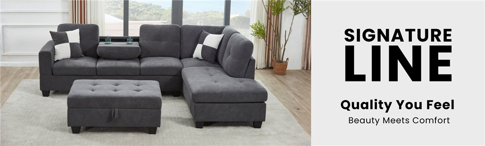 Upgrade your space with the NEBULA sectional sofa. Featuring a movable ottoman, drop-down console and USB port, it's perfect for gatherings. This dark grey upholstery is graceful. With chenille fabric and small pillows, it's both comfortable and durable.
