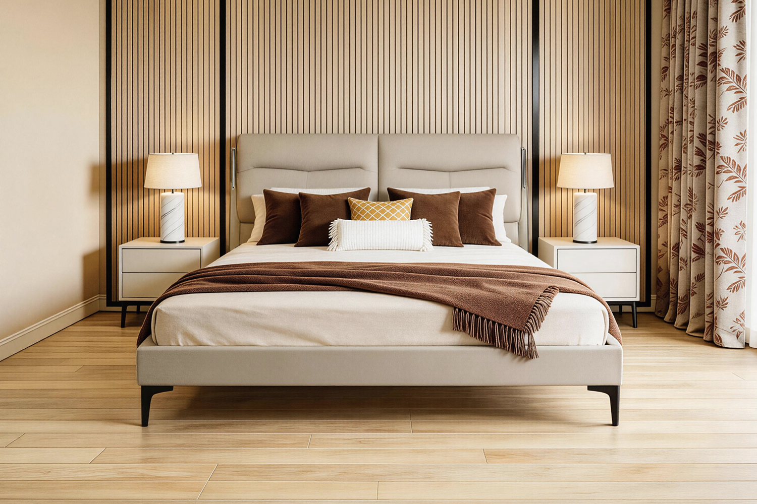 This bedside table features smooth vegan leather upholstery and a clean, minimalist design. With two practical drawers for everyday storage, sleek black handles, and tapered legs that lift the unit slightly off the floor, it offers both style and functionality for contemporary bedrooms.
