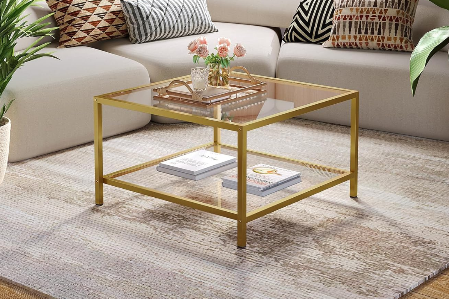 This elegant 2-tier coffee table features a spacious top and a second shelf for organization. With clear glass and a sturdy golden metal frame, it adds a modern, luxurious touch. Made from explosion-proof tempered glass and durable materials, it’s easy to maintain. Its versatile design fits seamlessly into any room with a clean, modern look.