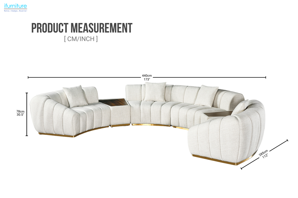 This modular sectional sofa features a durable engineered wood frame and a stylish curved golden metal base. The plush seat cushions, made with pocket coils and foam, offer comfort and support. Two functional console tables provide convenient surfaces for décor or drinks. Its spacious curved design is perfect for larger spaces, and the customizable layout—including LAF, RAF, armless sections, and pillows—lets you adapt it to your home.