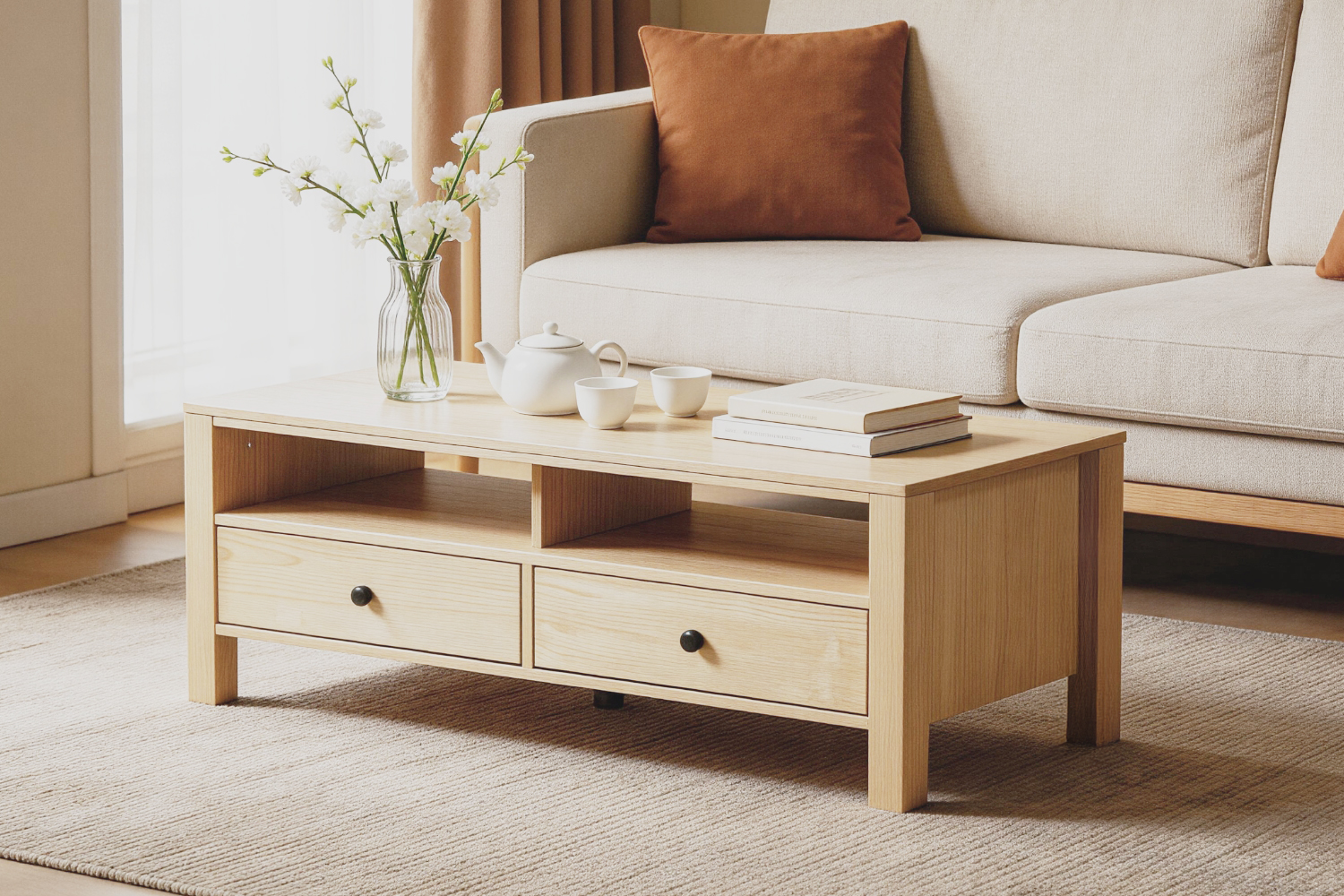 This coffee table features a smooth surface that is easy to maintain for everyday use. Two drawers keep small items neatly stored away, while the open shelf provides convenient space for remotes, magazines, or everyday essentials. The natural oak finish adds a clean, modern touch that blends easily with a variety of living room styles.