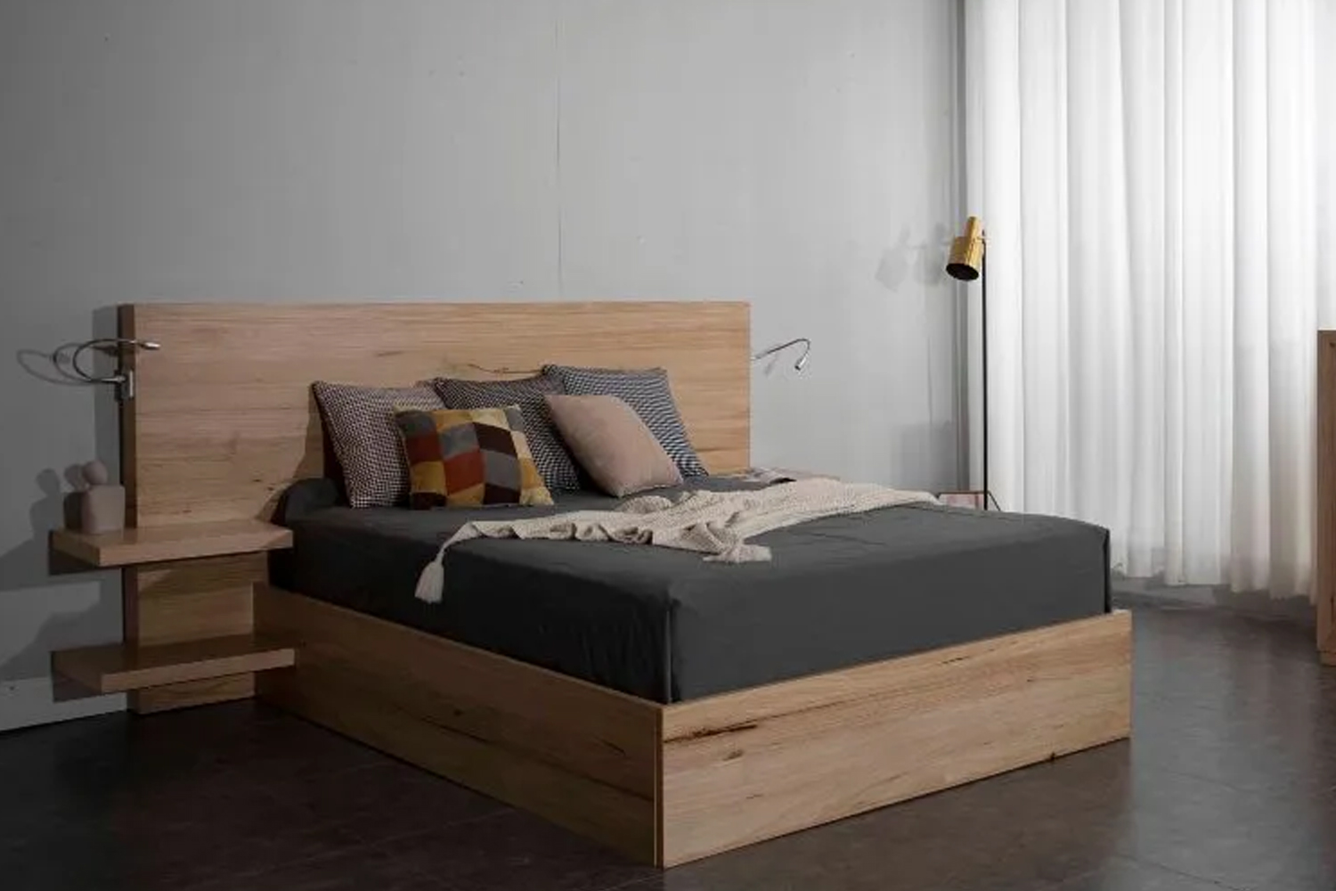 Ultra modern, this bed frame showcases an oversized bedhead with two side shelves, adjustable lights & USB ports on either side and solid hardwood slate. Minimalist design with effective subtle wood grains in a natural finish